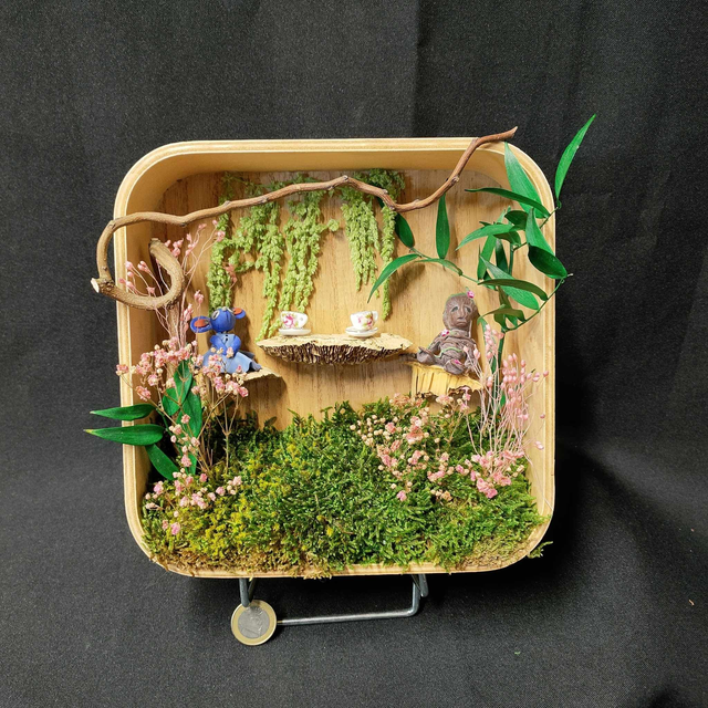 Cadre en végétaux stabilisés. Dimension: 20.5X20.5 cm. Personnages en porcelaine froide