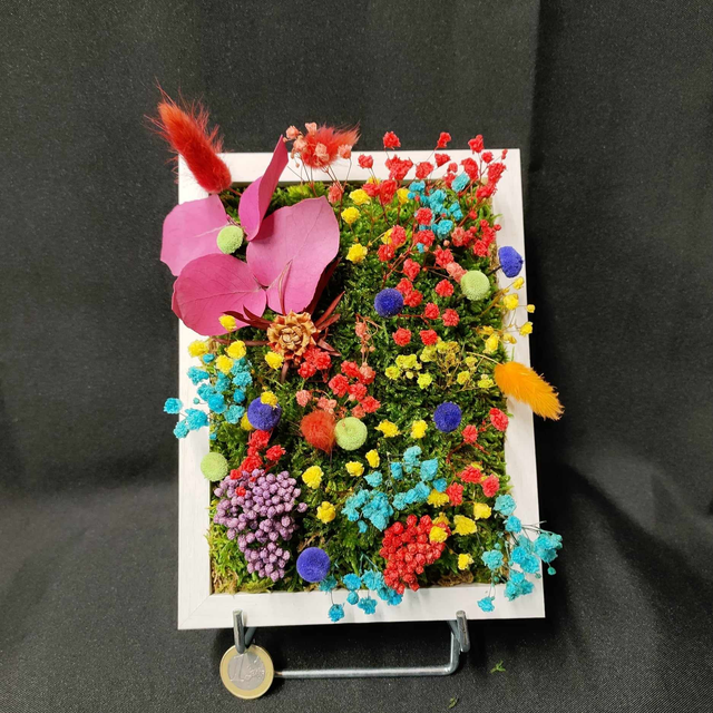 Cadre en végétal stabilisé. Dimension totale 19.5X14.5 cm Orientation: verticale. Cadre à crocher. Les végétaux éternels ou stabilisés ne nécessitent aucun entretien, ni arrosage! La stabilisation consiste à remplacer la sève naturelle de la plante par un produit de conservation, ainsi chaque plante va garder sa fraicheur et sa splendeur naturelle sans avoir besoin d'eau. Chaque création durera minimum 5 ans sans entretien. Toutefois ne pas exposer en plein soleil, ni dans une pièce humide et loin des sources de chaleur. Uniquement pour la décoration d'intérieur.